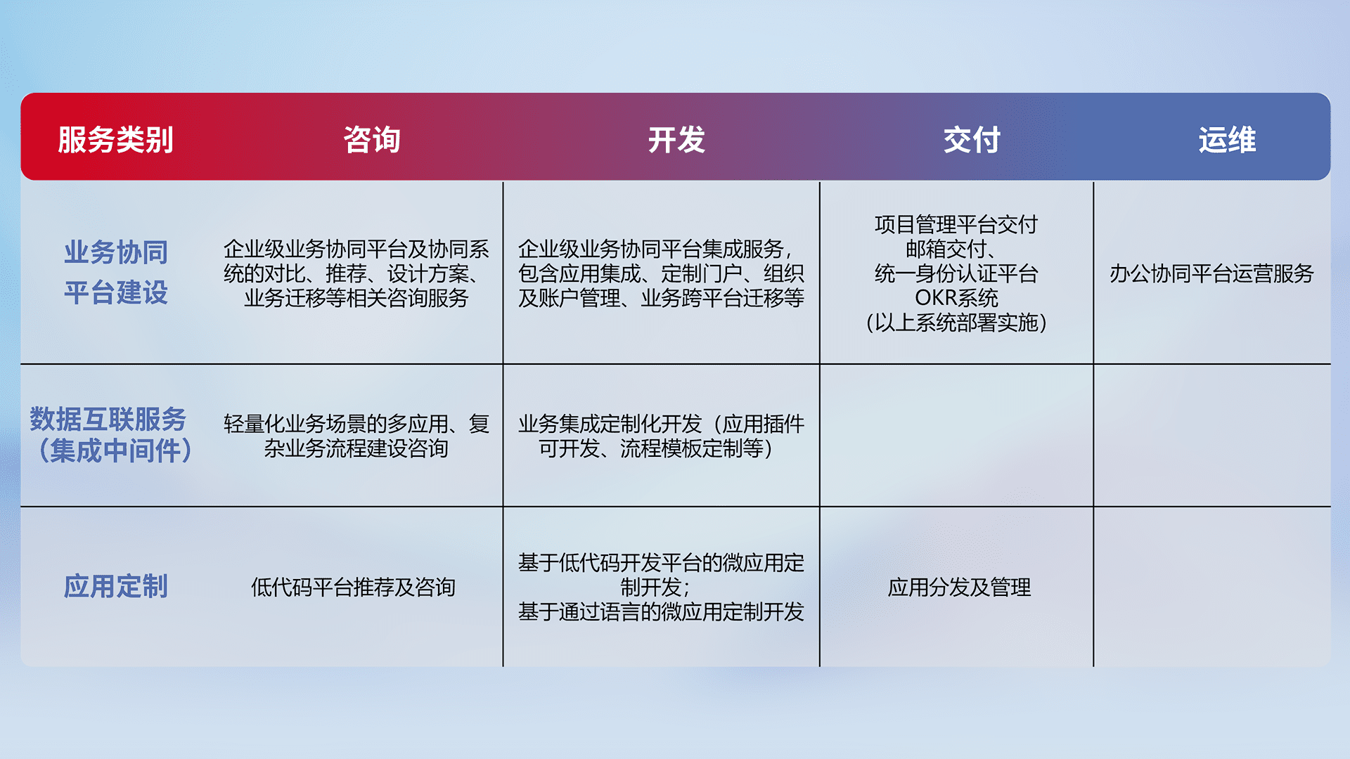 针对钉钉、、企微、、、、IDaas等平台级产品提供产品的规划、、、、方案、、交付、、、、定制化开发等服务,,实现如统一协同办公、、、、智能客户服务、、、混合会议管理、、智能数据查询、、、等业务场景,,,,实现数字化转型。。
